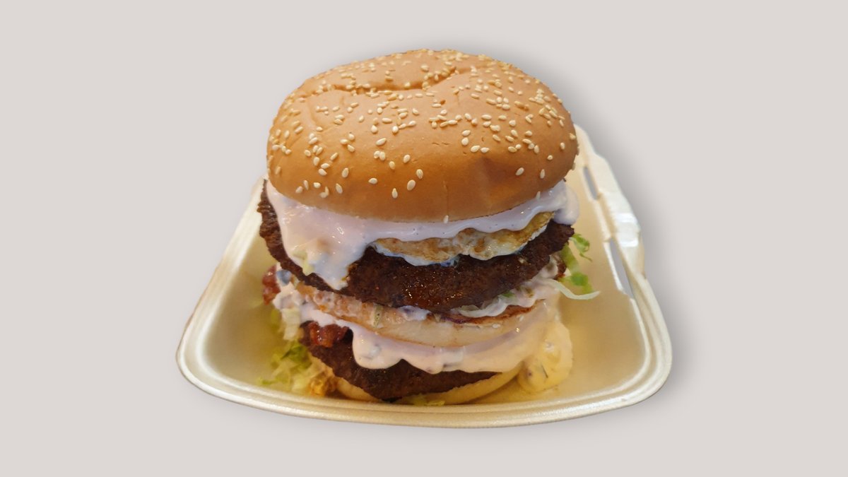 2x220g täyslihapihvi,paistettu pekoni,kananmuna,cheddar juusto