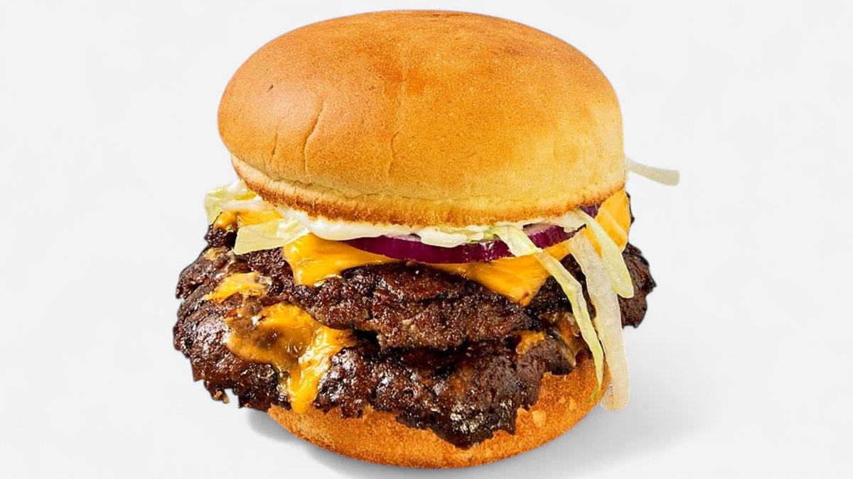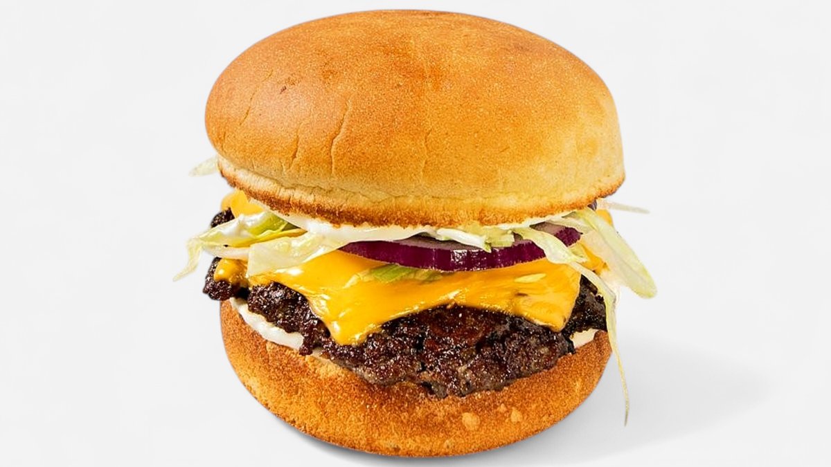 Yksi Beyond Meat-pihvi, pehmeä perunasämpylä, Burgaarina-valkosipulimajoneesi, kaksi viipaletta sulatettua cheddarjuustoa, suolakurkkuja, punasipulia ja tuoretta jäävuorisalaattia.