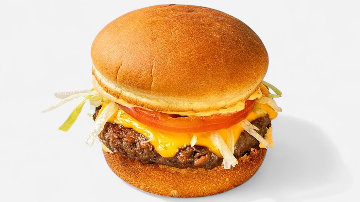 Yksi Beyond Meat-pihvi, pehmeä perunasämpylä, Burgaarina Chipotle-majoneesi, kaksi viipaletta sulatettua cheddarjuustoa, suolakurkkuja, punasipulia, tomaattia ja tuoretta jäävuorisalaattia.