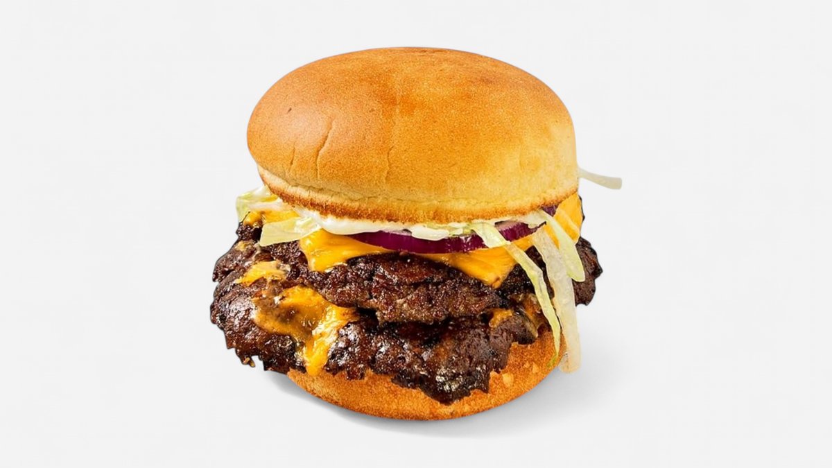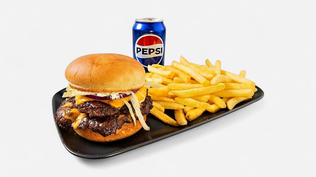 Kaksi 100g Smash-naudanpihviä, pehmeä perunasämpylä, Burgaarina Valkosipulimajoneesi, kaksi viipaletta sulatettua cheddarjuustoa, suolakurkkuja, punasipulia ja tuoretta jäävuorisalaattia. Lisäksi ranskalaiset & valitsemasi 0,33l juoma.