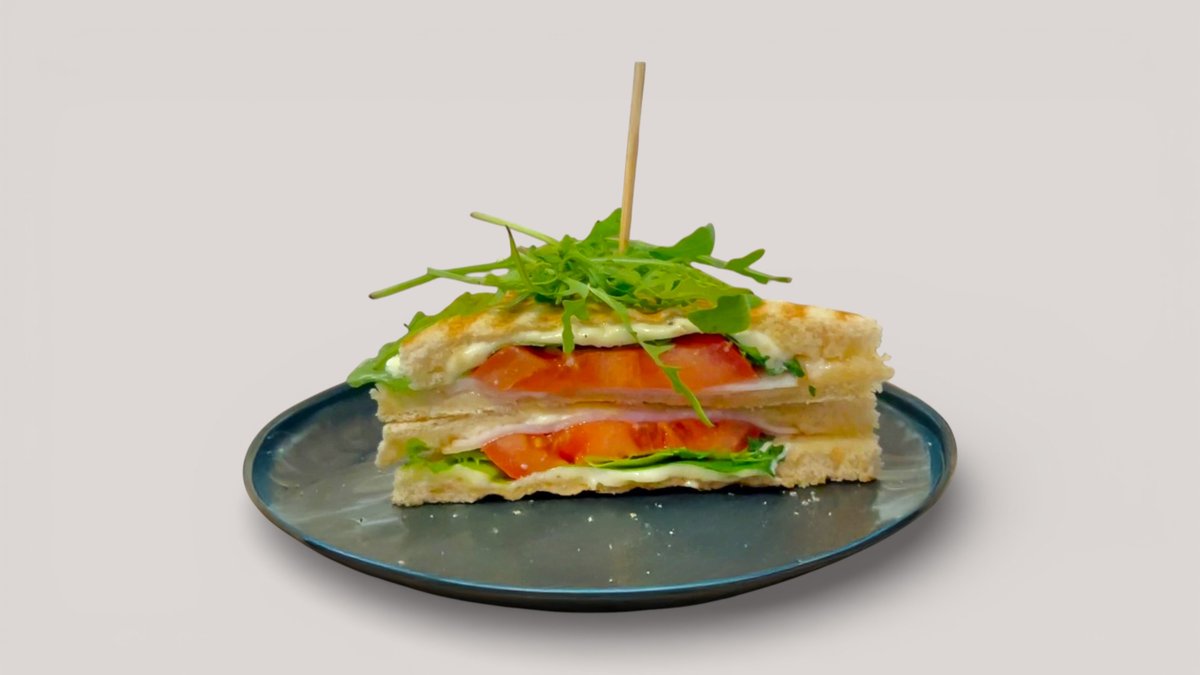 Paahtoleivän täytteenä raikas salatti, rucola, tomaatti, majoneesi ja runsaasti juustoa. Paistettu rapeaksi. Tehty tilauksesta – aina rapeana tarjolle!