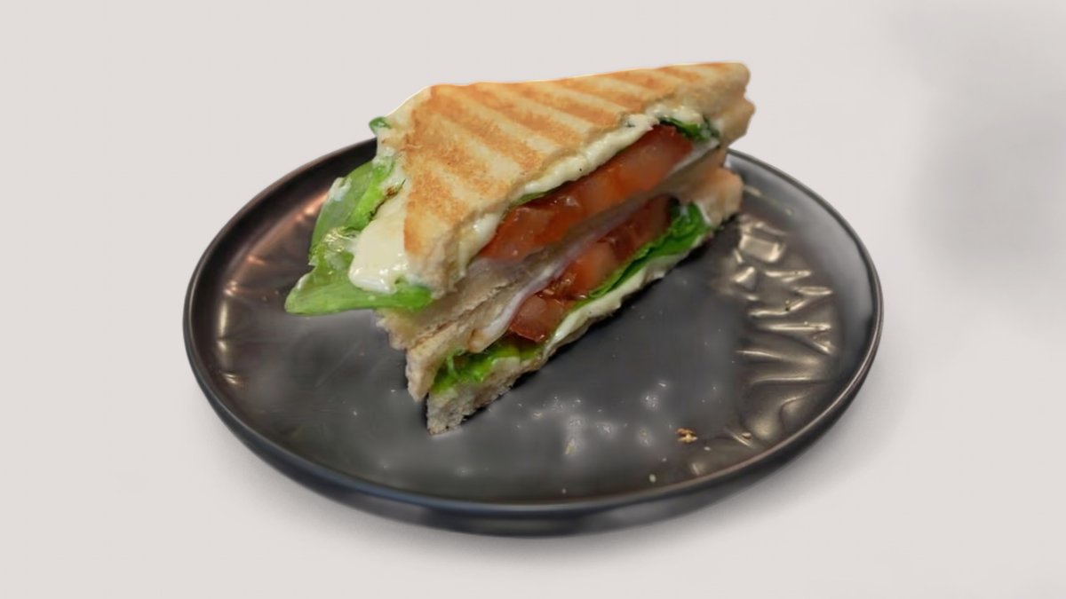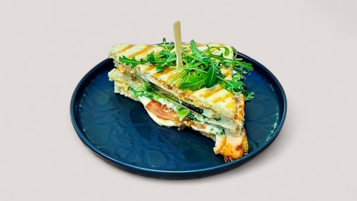Paahtoleivän täytteenä raikas salatti, rucola, tomaatti, majoneesi, pesto ja mozzarella juustoa. Paistettu rapeaksi. Tehty tilauksesta – aina rapeana tarjolle!