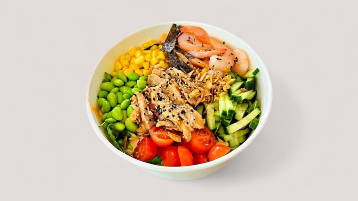 Prawn, Edamame, Maissi, Cucumber, Cherry Tomato, Avocado & Roasted Nuts. Base & Topping