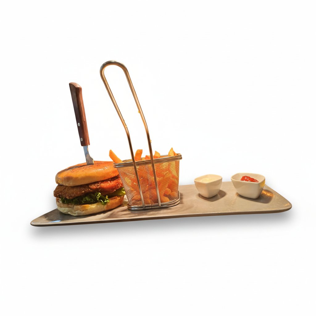 Coconut & cereal-crusted tender chicken, deep-fried and served with rucola, tomato, and caramelized onion, topped with melted smoked cheese. Accompanied by aioli mayonnaise sauce, french fries, and coleslaw salad.