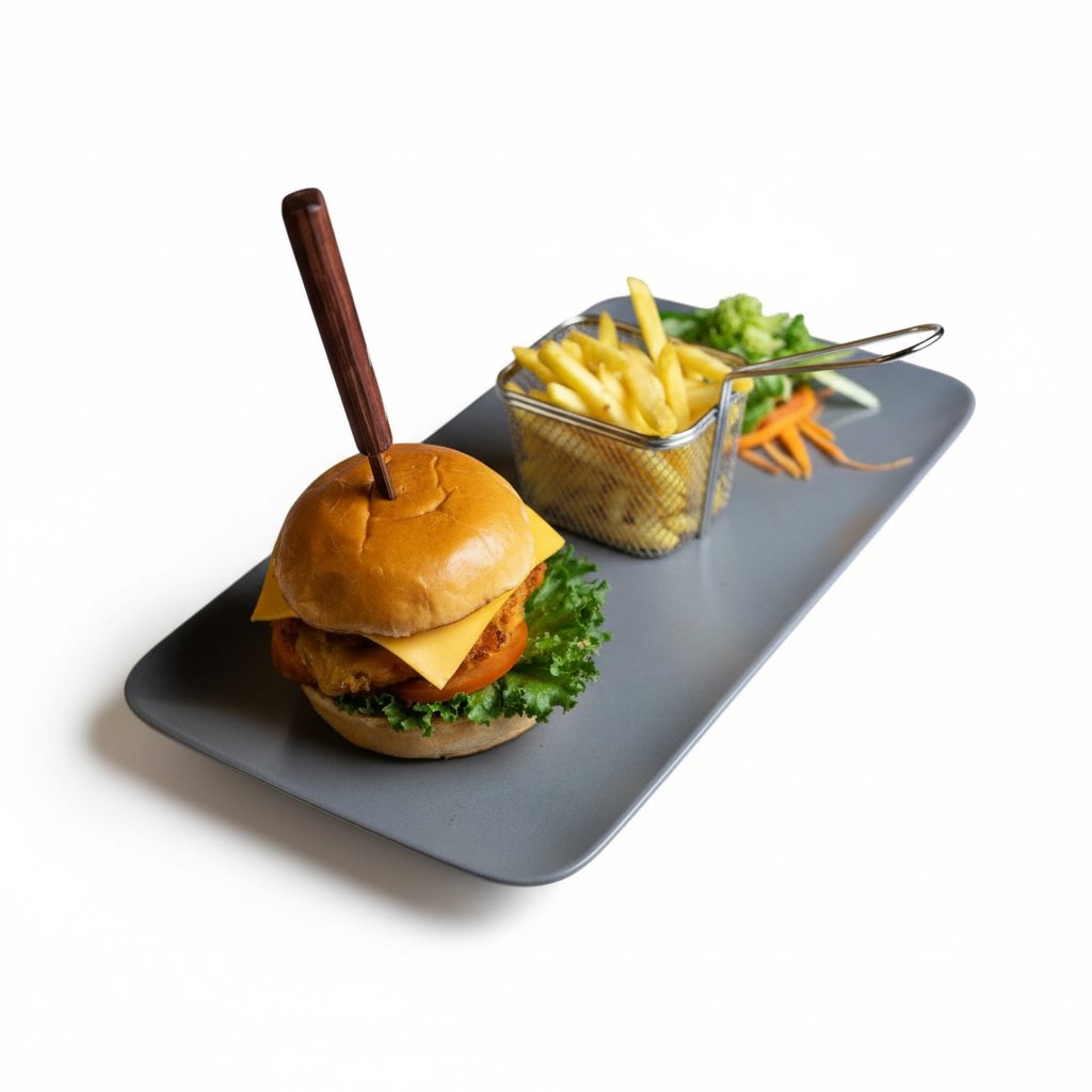 Five-spice-infused homemade grilled ground beef patty served on a bed of lettuce, tomato, and caramelized onion, topped with melted cheddar cheese. Accompanied by confit green chili savory mayon-naise and coleslaw salad with deep-fried potato strips.