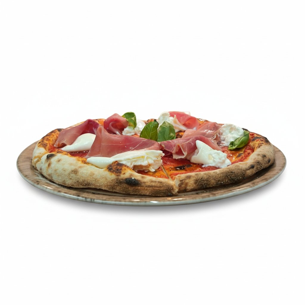 Pizza baked with fresh tomato sauce, parma ham, burrata, basil leaves, and olive oil.