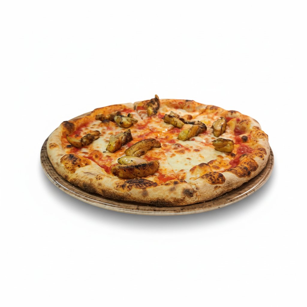 Fresh tomato sauce, fresh mozzarella, fried eggplant, boiled egg, prosciutto cotto, grated parmesan, basil tips, and olive oil.