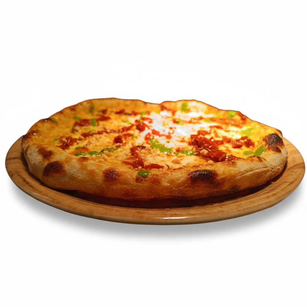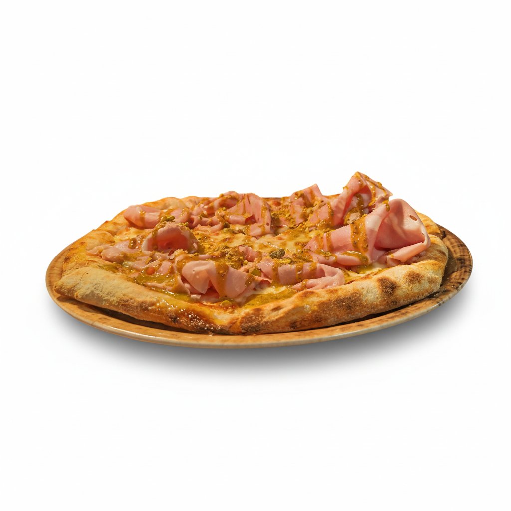 Pizza baked with fresh mozzarella and mortadella (bologna), pistachio cream granella pistachio, basil olive oil.