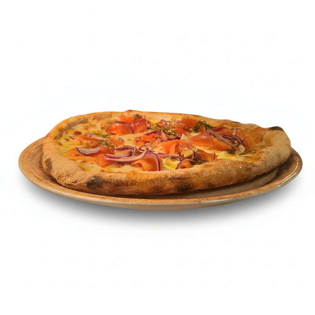 Pizza baked with fresh mozzarella, smoked salmon, crème fraîche dill leaves, red onion, olive oil and capers.