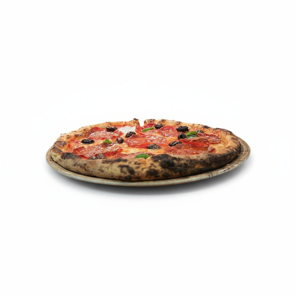 Fresh tomato sauce, salame piccante, black olives, basil, and olive oil.
