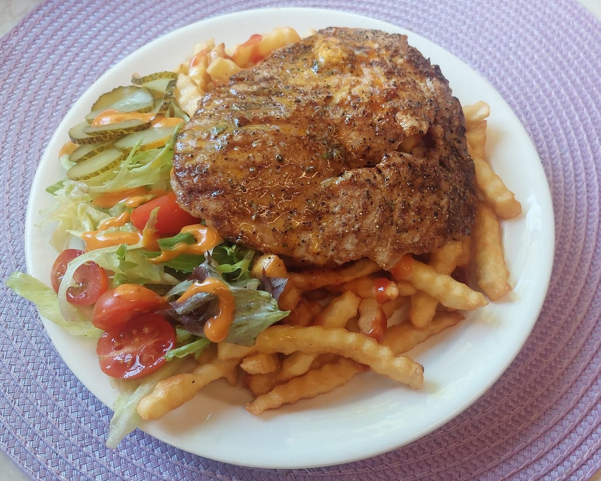 Valitsemasi liha (possunleike / ylikypsä possu / grillimakkaraa), maalaislohkoperunat, salaatti ja ruskea kastike.