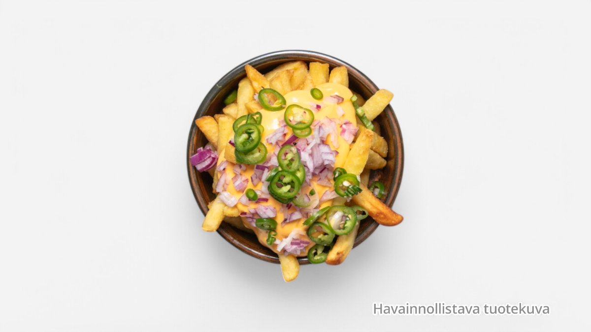 Ranskalaisia perunoita, haudutettua sipulia, pekonia, srirachamajoneesia ja kevätsipulia. French fries, stewed onion, bacon, sriracha mayonnaise and spring onion.