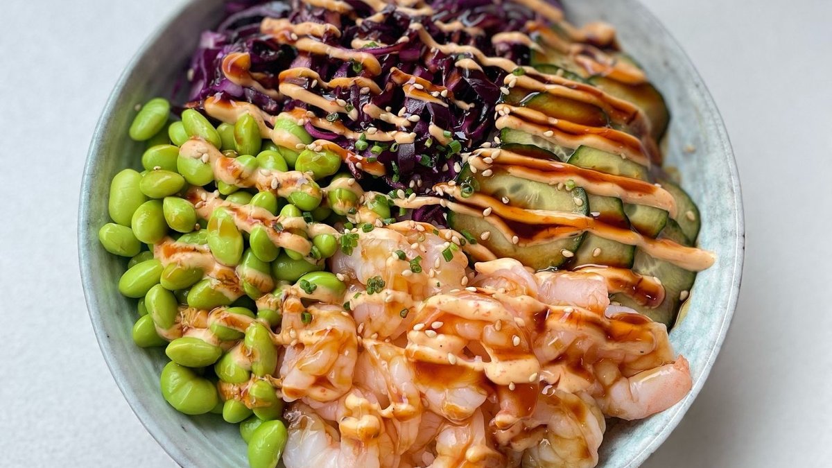 Riisi, katkaravun pyrstöt, pikkelöidyt kurkut, pikkelöity punakaali, edamamepavut, unagi kastike, seesaminsiemenet, ruohosipuli + valitsemasi kastike