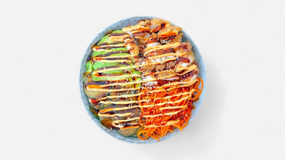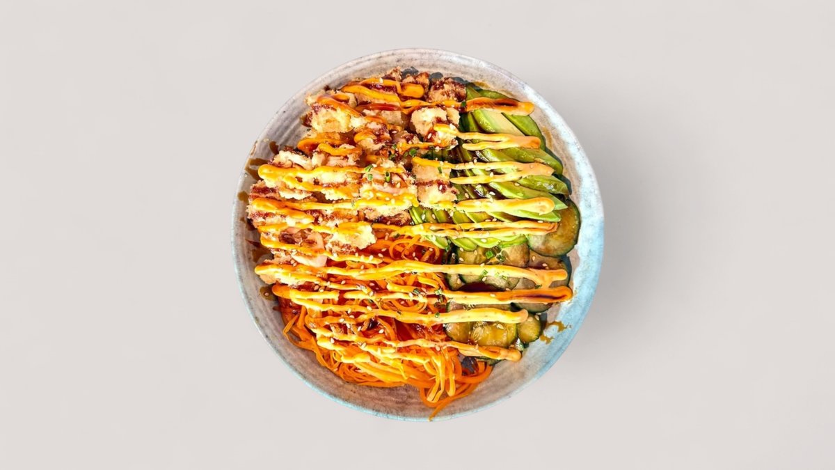 Riisi, uppopaistetut kanansisäfileet, spicy korealainen porkkana, pikkelöidyt kurkut, unagi kastike, avokado, seesaminsiemenet, ruohosipuli + valitsemasi kastike