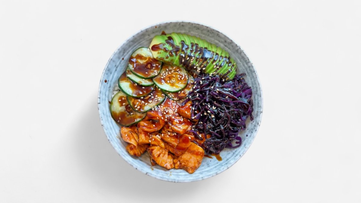 Riisi, paistettu teriyaki lohi, pikkelöidyt kurkut, pikkelöity punakaali, avokado, unagi kastike, seesaminsiemenet, ruohosipuli + valitsemasi kastike