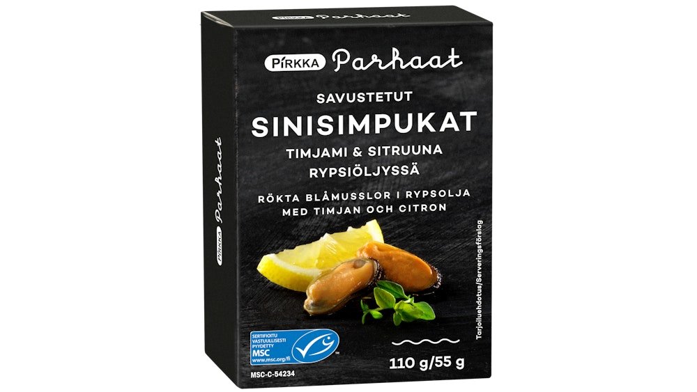 Pirkka Parhaat savustetut sinisimpukat timjami-sitruuna rypsiöljyssä 110g/55g MSC