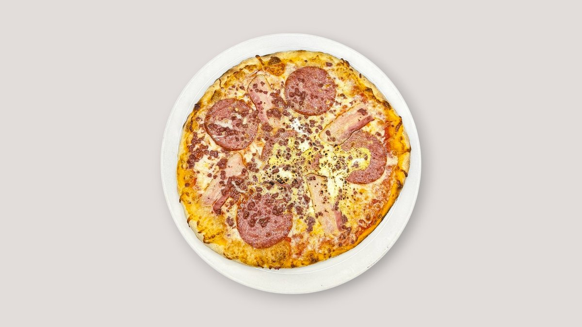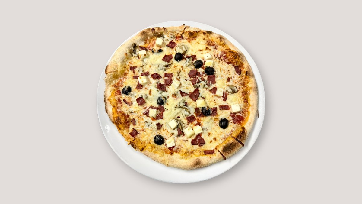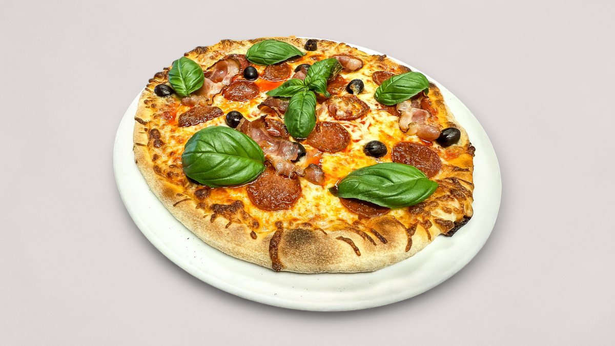 Pepperoni-makkaraa, oliivejä, tuoretta basilikaa, pekonia, tuplajuustoa