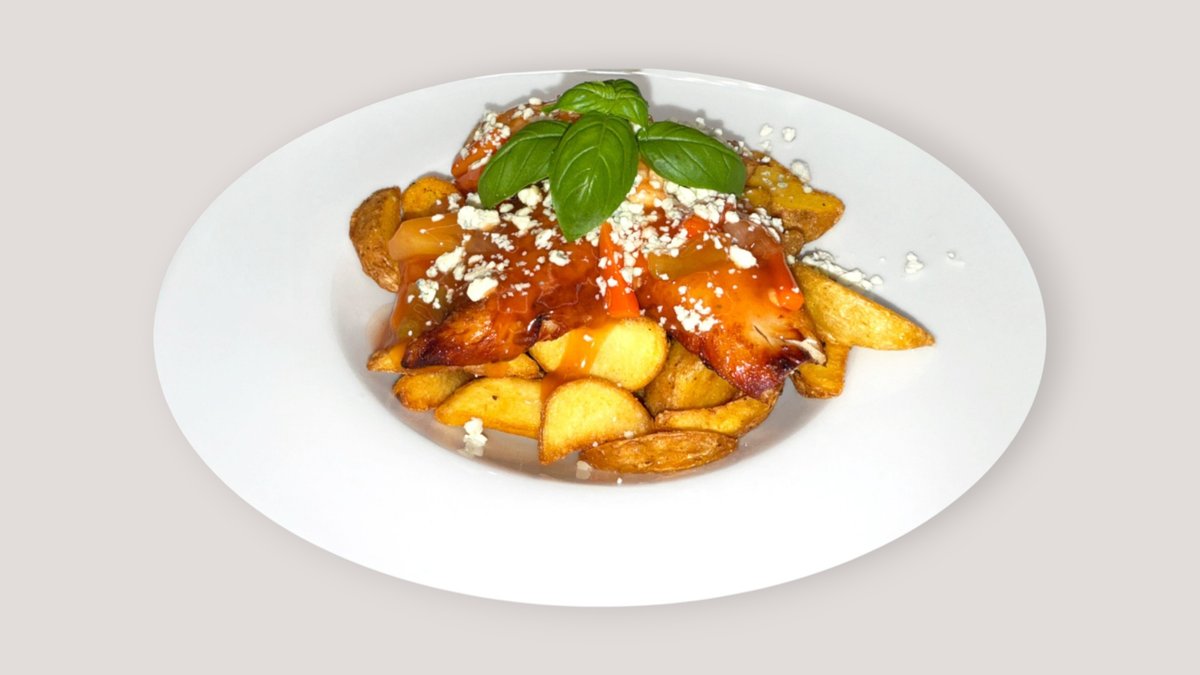 Kanaa, aurajuustoa, sweet & sour -kastiketta, tuoretta basilikaa ja valitsemasi perunat