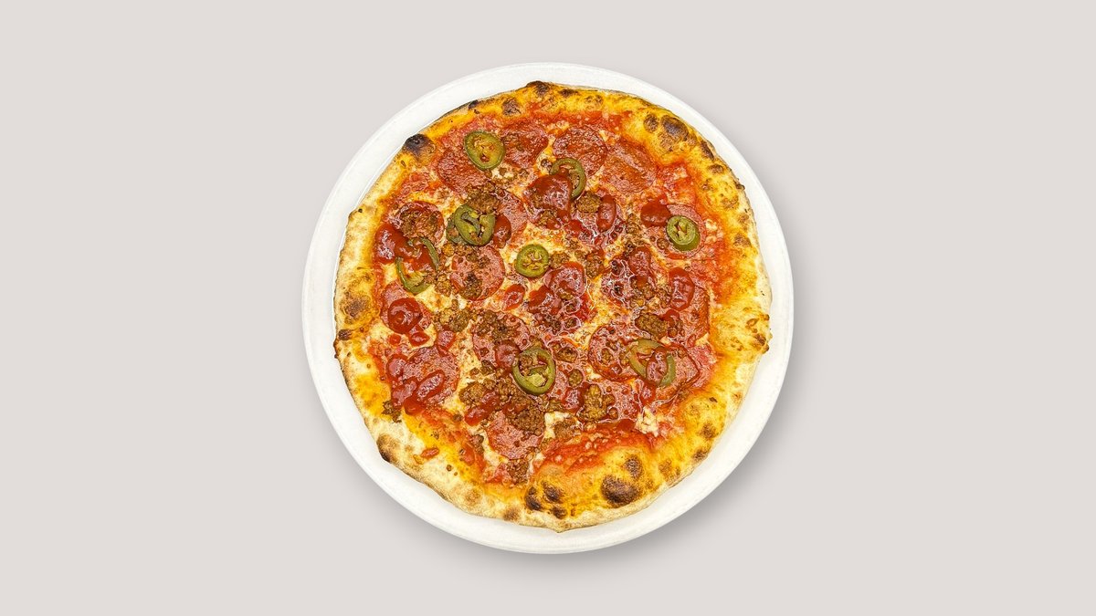 Jauhelihaa, pepperoni-makkaraa, jalapenoja, mieto chilikastiketta