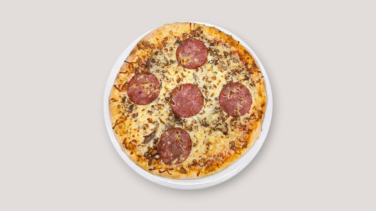 Pizzasuikale, sipulia, jauhelihaa, salamia, tuplajuustoa