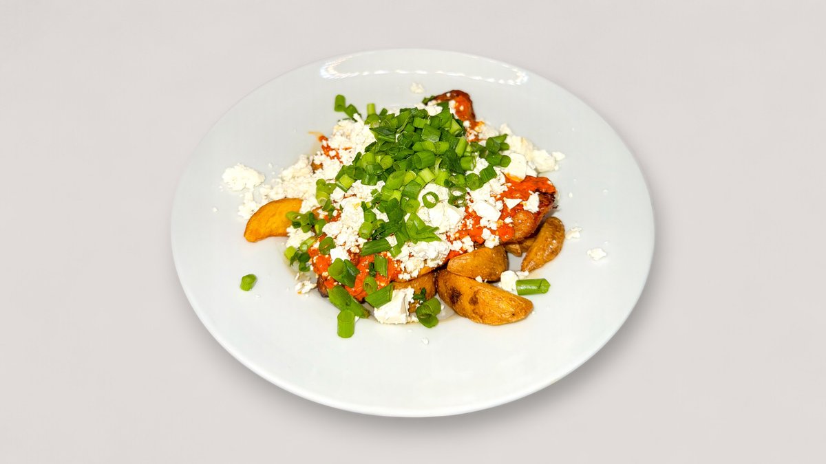 Kanaa, fetajuustoa, hunajaa, ajvar-kastiketta, kevätsipulia ja valitsemasi perunat