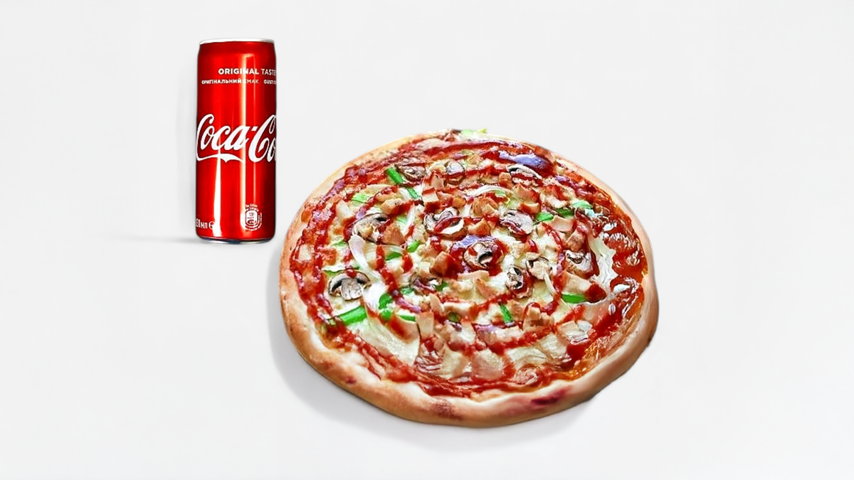 Italialainen pizza neljällä täytteelläsi ja maukkaalla mozzarellalla + 500 ml Coca-Colaa