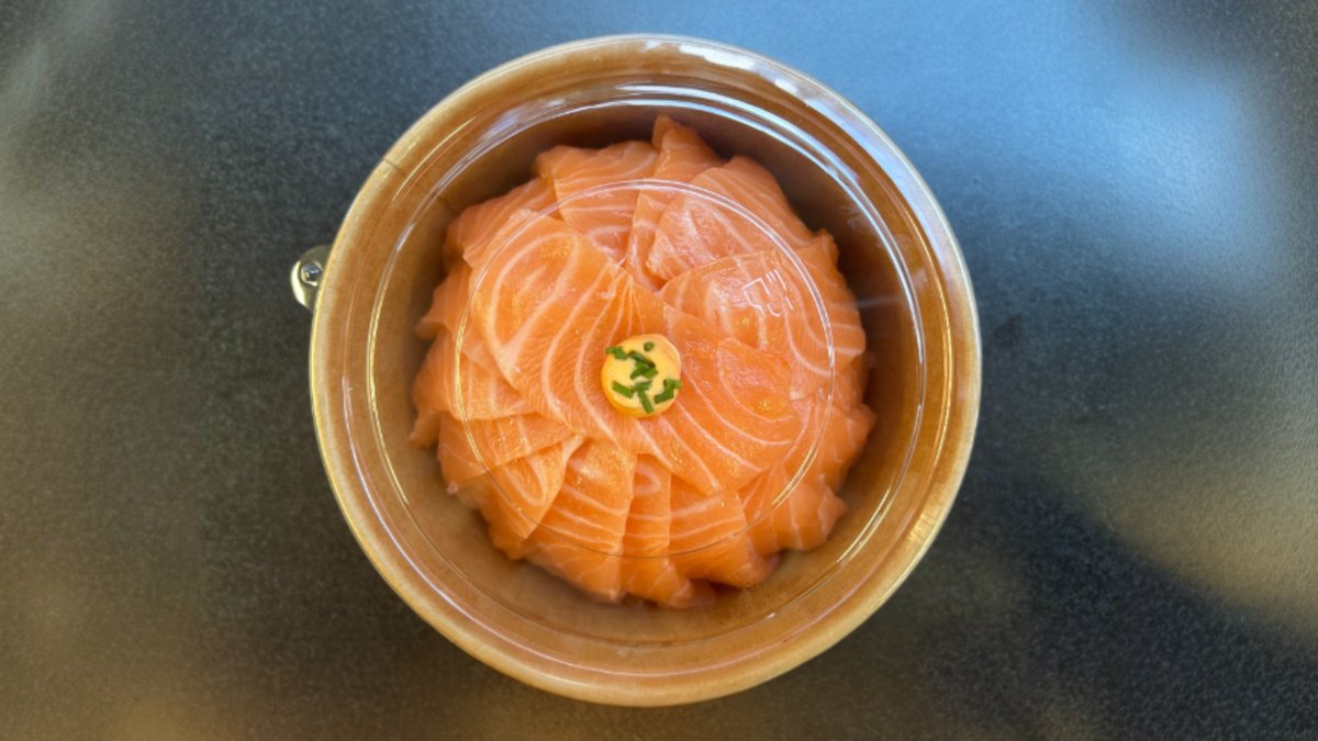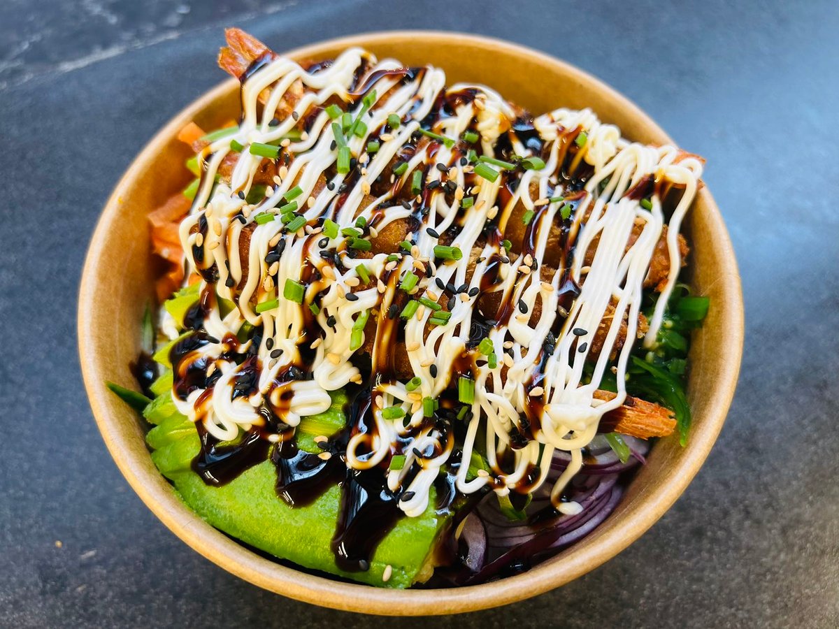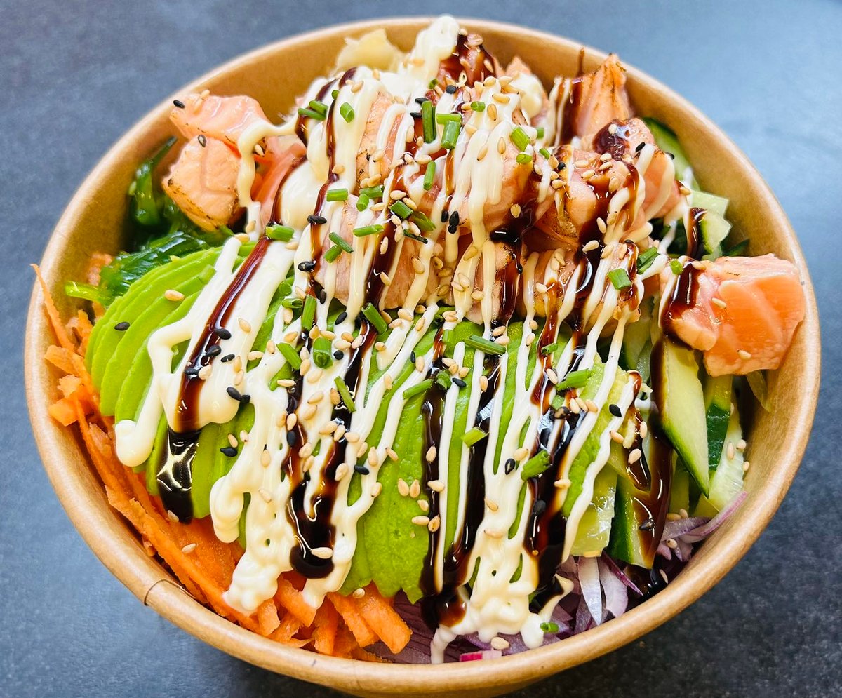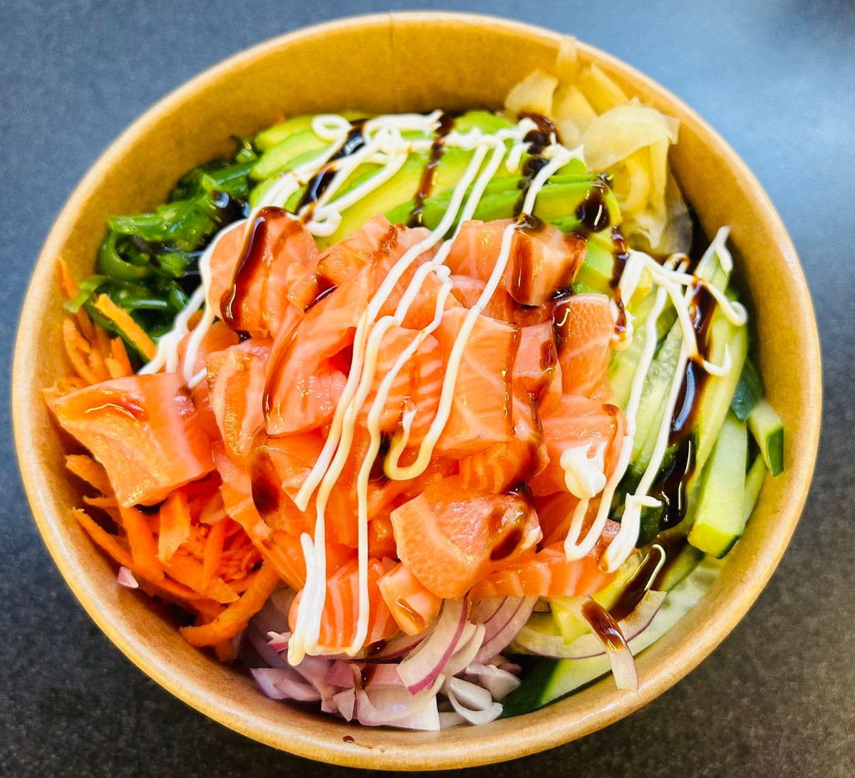 Grillattu lohi,punasipuli.avokado.kurkku.porkkana.wakame.inkivaari.sushiriisi.unagi sauce kastike,majoneesi,kevatsipuli,seesami