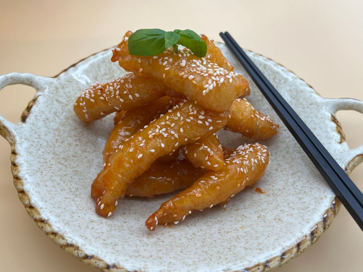50. Friteerattuja jättikatkarapuja hapanimeläkastikkeella