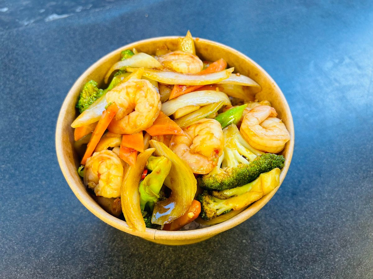 Paistettu katkarapuja kasvis (sipuli.porkkana parsakaali.chili.).+riisi