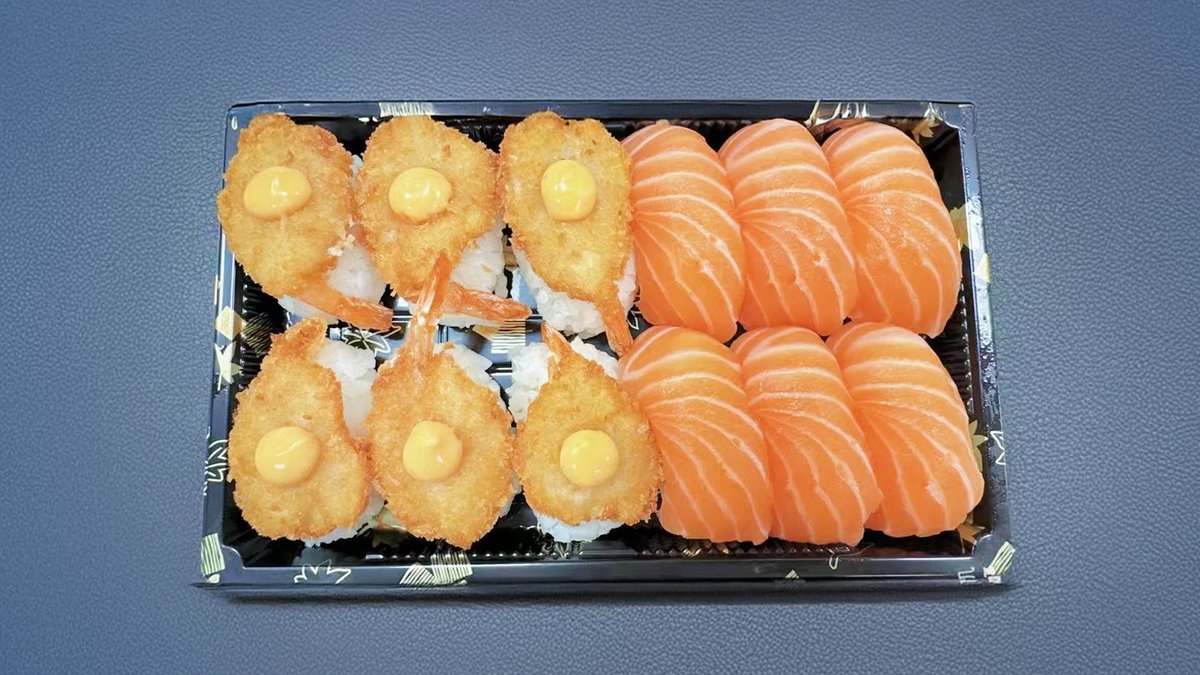 Lohi x 15 Katkarapu x 10 Tonnikala-majoneesi x 13 Grillattu lohi x 15 Yakimaki x 8 Kappamaki x 8 Shakemaki x 8 Tokyomaki Tempura x 8