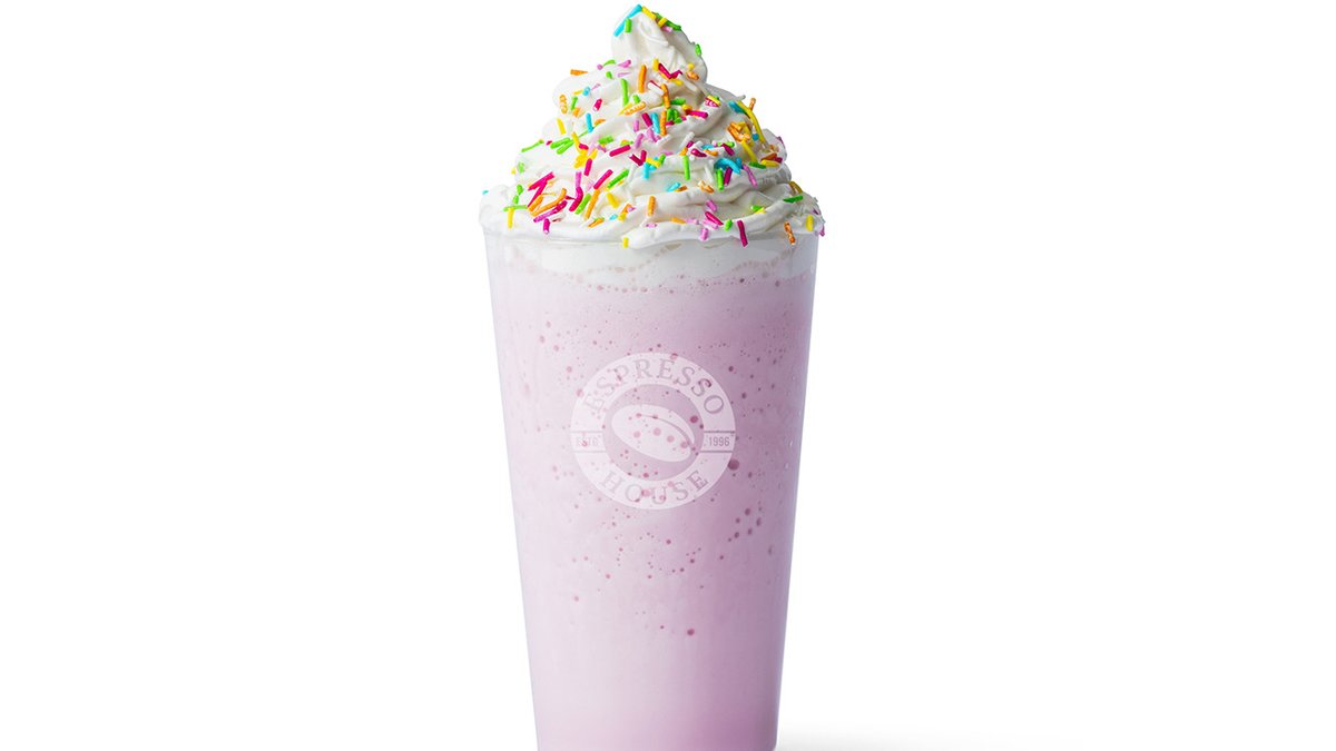 Rubiinisuklaasiirapilla maustettu vaniljashake, viimeistelty kermavaahdolla ja värikkäillä strösseleillä. Ei sisällä kofeiinia. Kotiin kuljetettavassa tuotteessa mukana extrajääpaloja. Ulkonäöllisesti kotiin kuljetettava tuote voi poiketa hieman kahvilassa nautittavasta tai itse noudetusta tuotteesta.