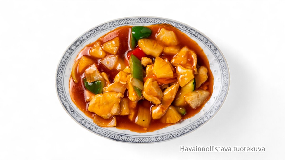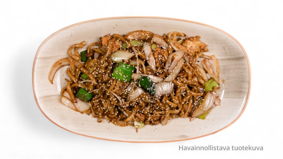 Paistettuja nuudeleita, kanaa ja kauden kasviksia maustekastikkeella (L)