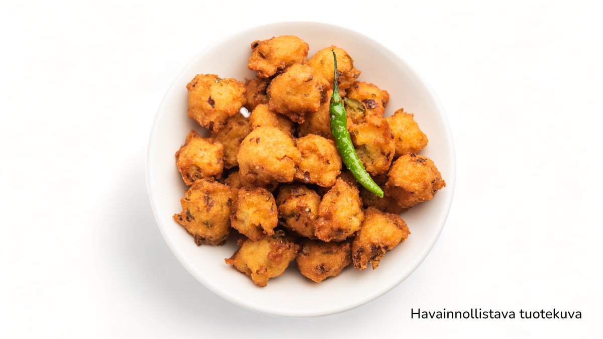 Linssijauholla kuorrutetut ja friteeratut kanafilee palat (Tarjoillaan minttu chutneyn ja salaatin kera)