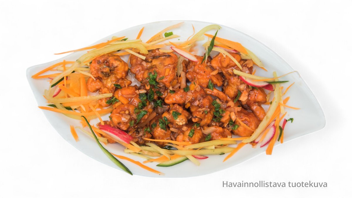 Linssijauholla kuorrutettua ja friteerattua tuorejuustoa, paprikaa ja sipulia mausteisessa tomaatti-, chili-, valkosipuli-, inkivääri- ja soijakastikkeessa (G)