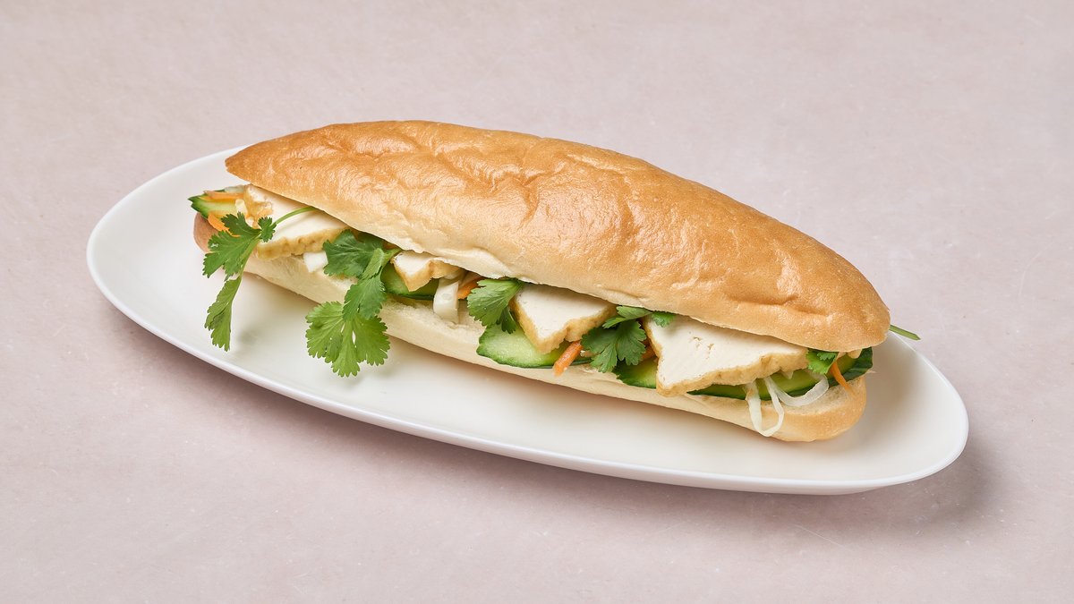 Vietnamilainen patonki, joka sisältää paistettu tofua, pikkelssiä, sipulia, porkkanaa, kurkkua, yrttejä ja soijakastiketta.