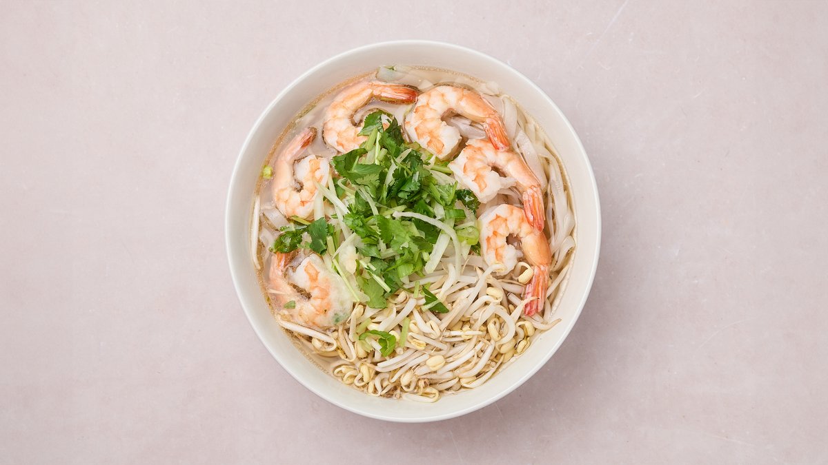 Phở - keitto, jossa pitkään haudutettua lihaliemessä, jättikatkarapuja, riisinuudeleita ja tuoreita yrttejä.