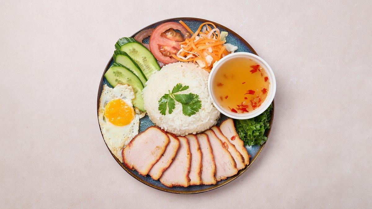 Vietnamilainen riisiannos, jossa on grillattua kiinalaista porsaanniskaa, paistettu kananmuna, kurkkua, tomaattia, pikkelöityjä vihanneksia. Tarjoillaan kalakastikkeen kanssa