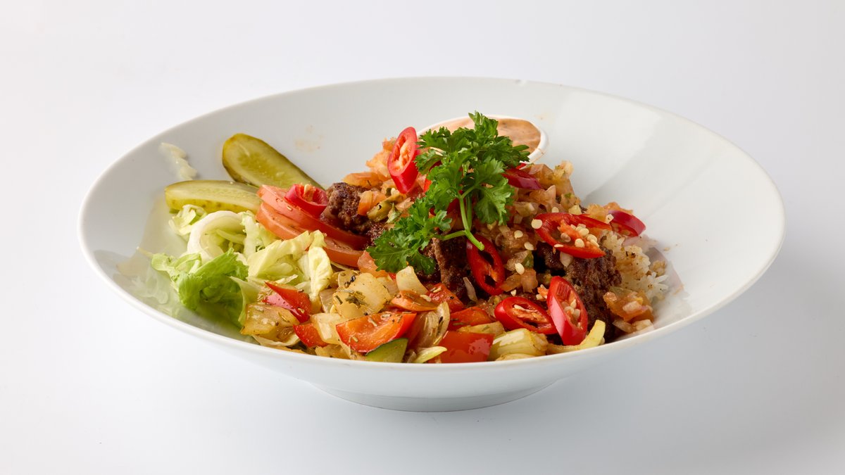 Mexican risottoa, salaattia, salsa rojaa, paahdettuja kasviksia, tomaattia, suolakurkkua, tuoretta chiliä, lime-cremeä
