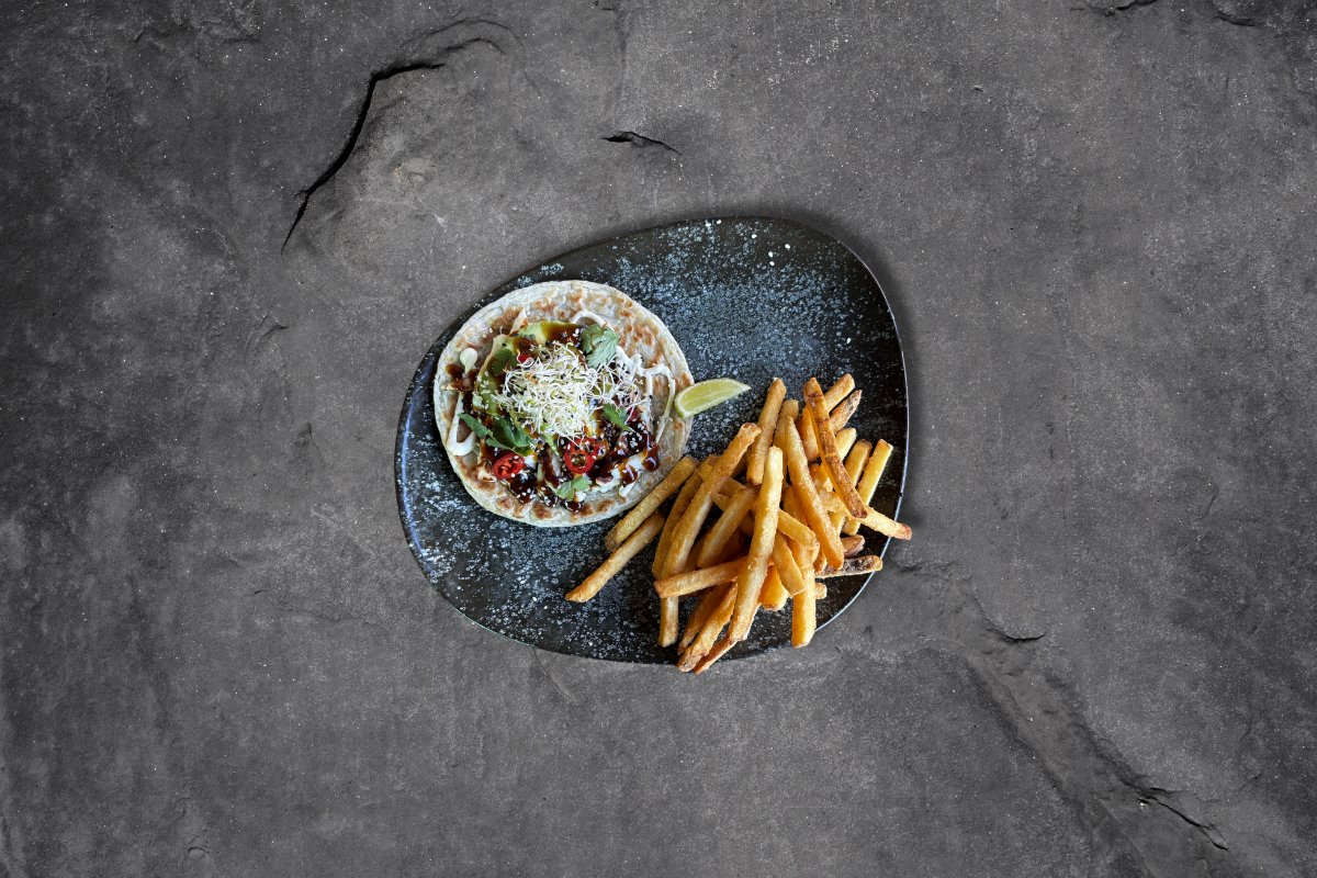 Parathaleipä, aioli, avokado, Hoisinkastike, chili, ituja, korianteri, lime, seesaminsiemeniä & rapeaa valkosipulia. Tarjoillaan ranskalaisten kera.