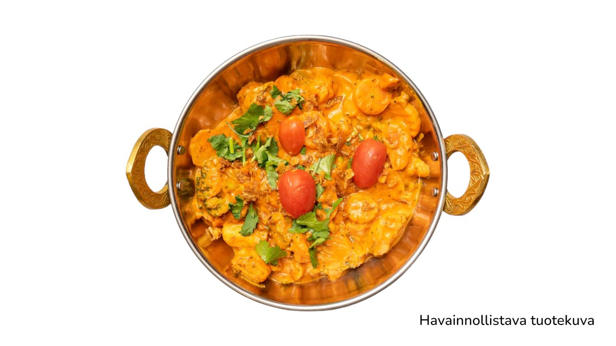 Perinteisissä intialaisissa mausteissa kypsennettyä kanaa ja tomaattikastiketta