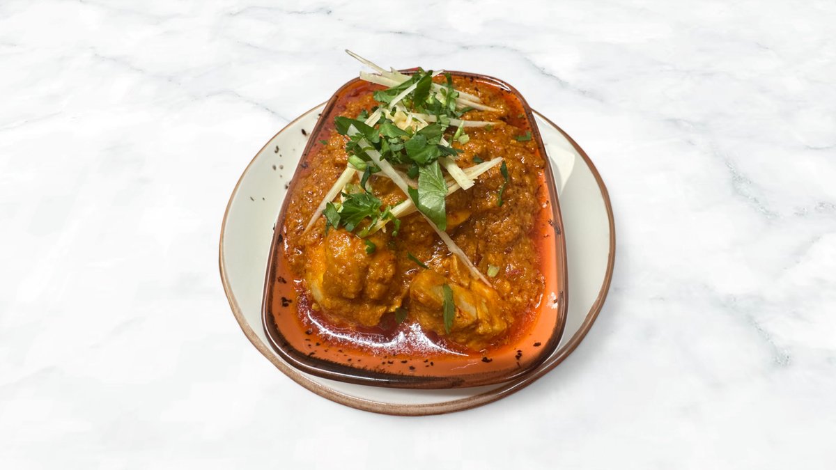 Marinoitua ja tandoorissa grillattua kanaa inkivääri-, sipuli-ja tomaattikastikkeessa