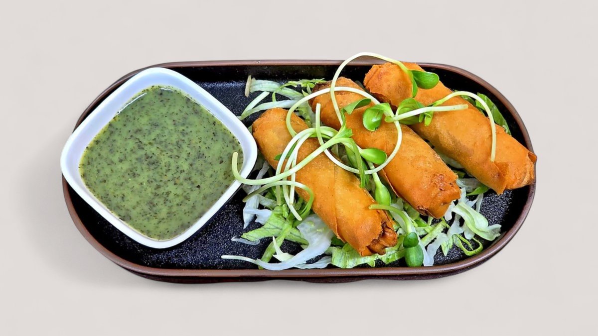 Spinach balls in a rich curry, layered on a bed of rice with lettuce, onions, tomatoes and cucumber