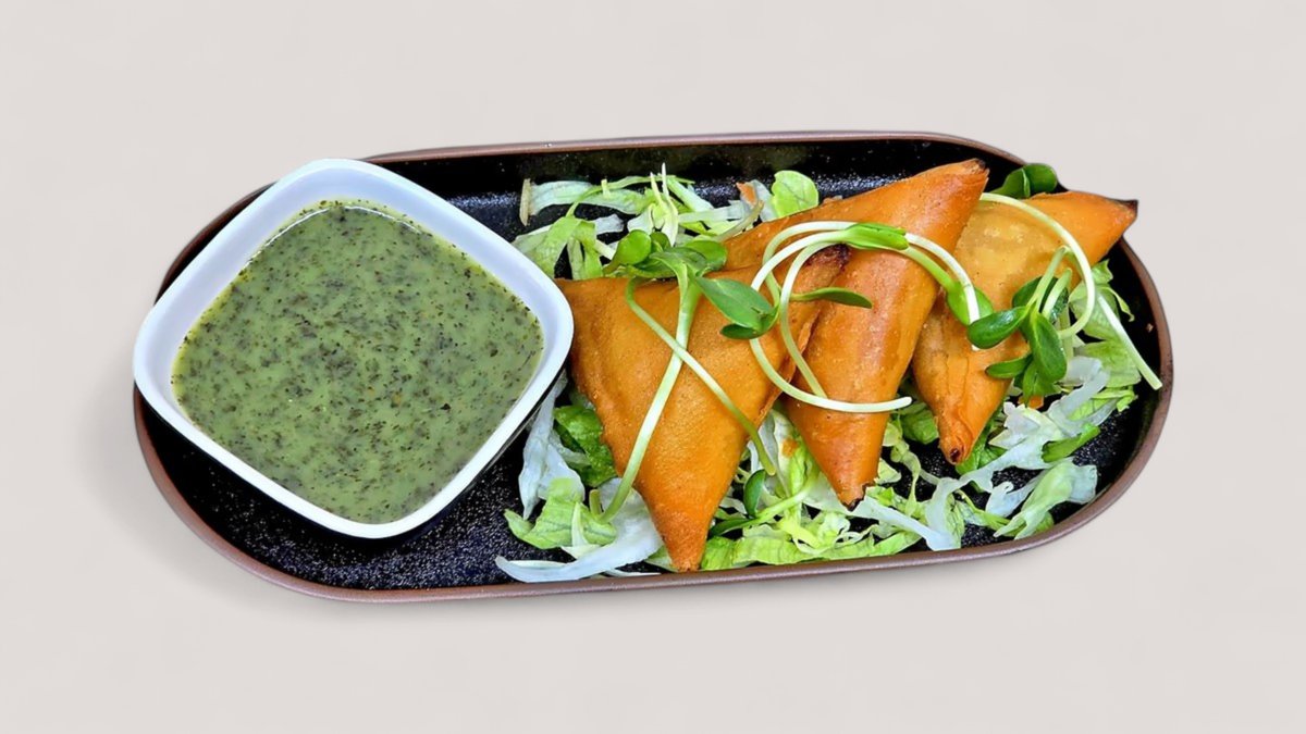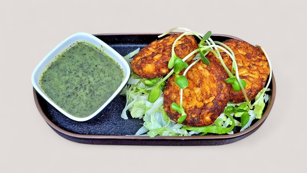 Tofu tikka pieces layered on a bed of rice with lettuce, onions, tomatoes and cucumber