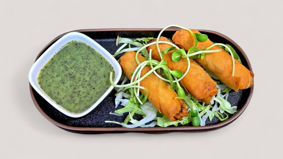 Paneer tikka pieces layered on a bed of rice with lettuce, onions, tomatoes and cucumber