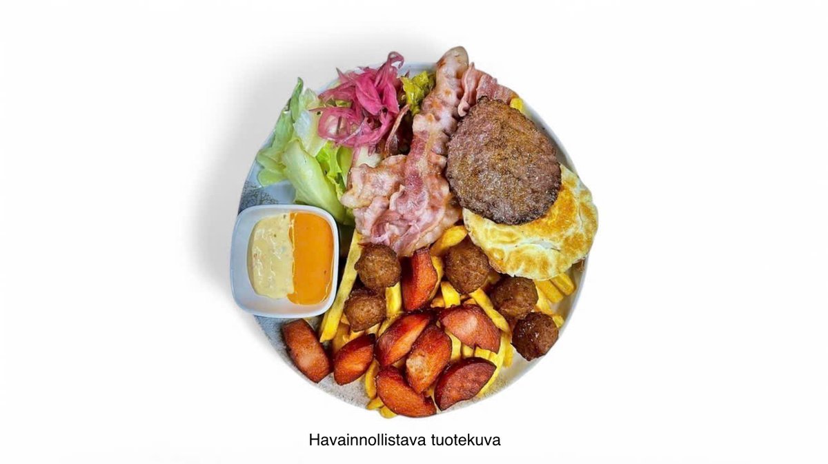 Lihapiirakka, pihvi 90g, jahtimakkara, pekoniviipaleet, kananmuna, juustoviipale Mausteet: Ketsuppi, Majoneesi, Sinappi, Raaka Sipuli, Kurkkusalaatti.