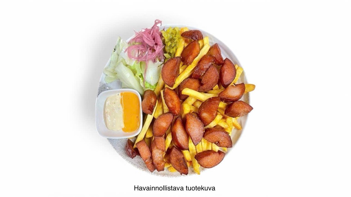 Lihapullat 250g, ranskalaiset Mausteet: Ketsuppi, Majoneesi, Sinappi, Raaka Sipuli, Kurkkusalaatti. Ei salaattia