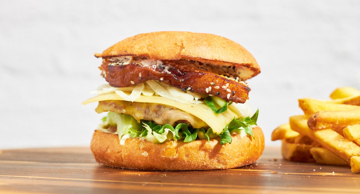 Kaksi smashpihviä kotimaisesta naudanjauhelihasta, Jukolan cheddarjuustoa, pekonia, suolakurkkua, tomaattia, salaattia, marinoitua punasipulia ja talon majoneesia
