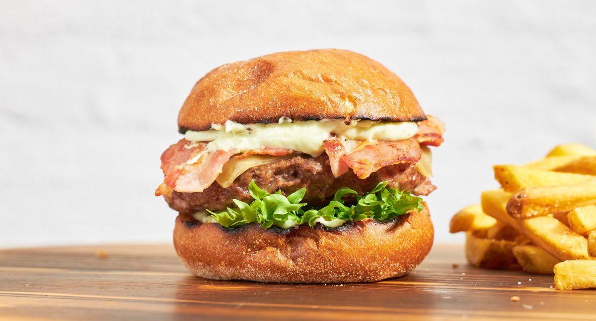 Avoin burgeri, jossa kaksi smashpihviä kotimaisesta naudanjauhelihasta, talon majoneesia, salaattia, tomaattia, pekonihilloa ja Gorgonzolajuustoa