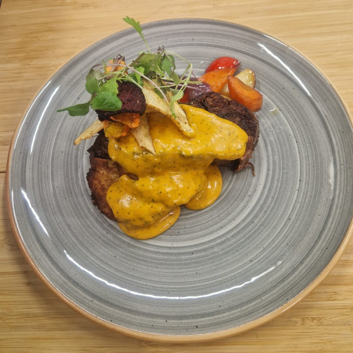 Ylikypsää härän niskaa, Café de Paris -kastiketta, röstiperunaa, kauden kasviksia sekä rapeita juureslastuja. *Kastike sisältää kalaa.