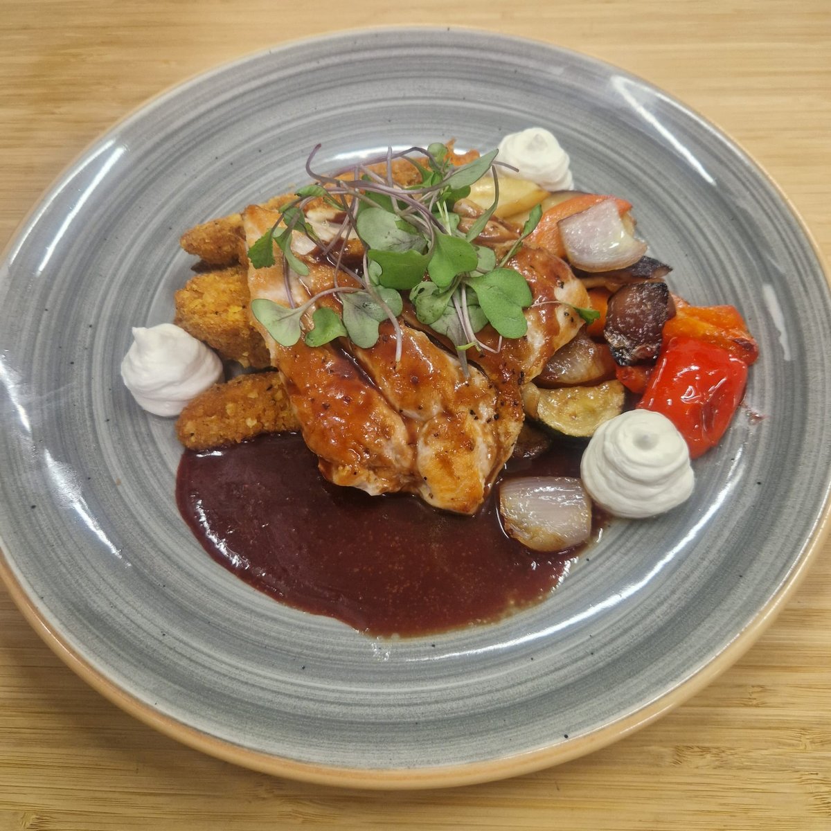 Paistettua broilerinfileetä, tummaa mustaherukkakastiketta, rapeita bataattilohkoja, kauden kasviksia, vuohenjuustomoussea sekä juureslastuja.
